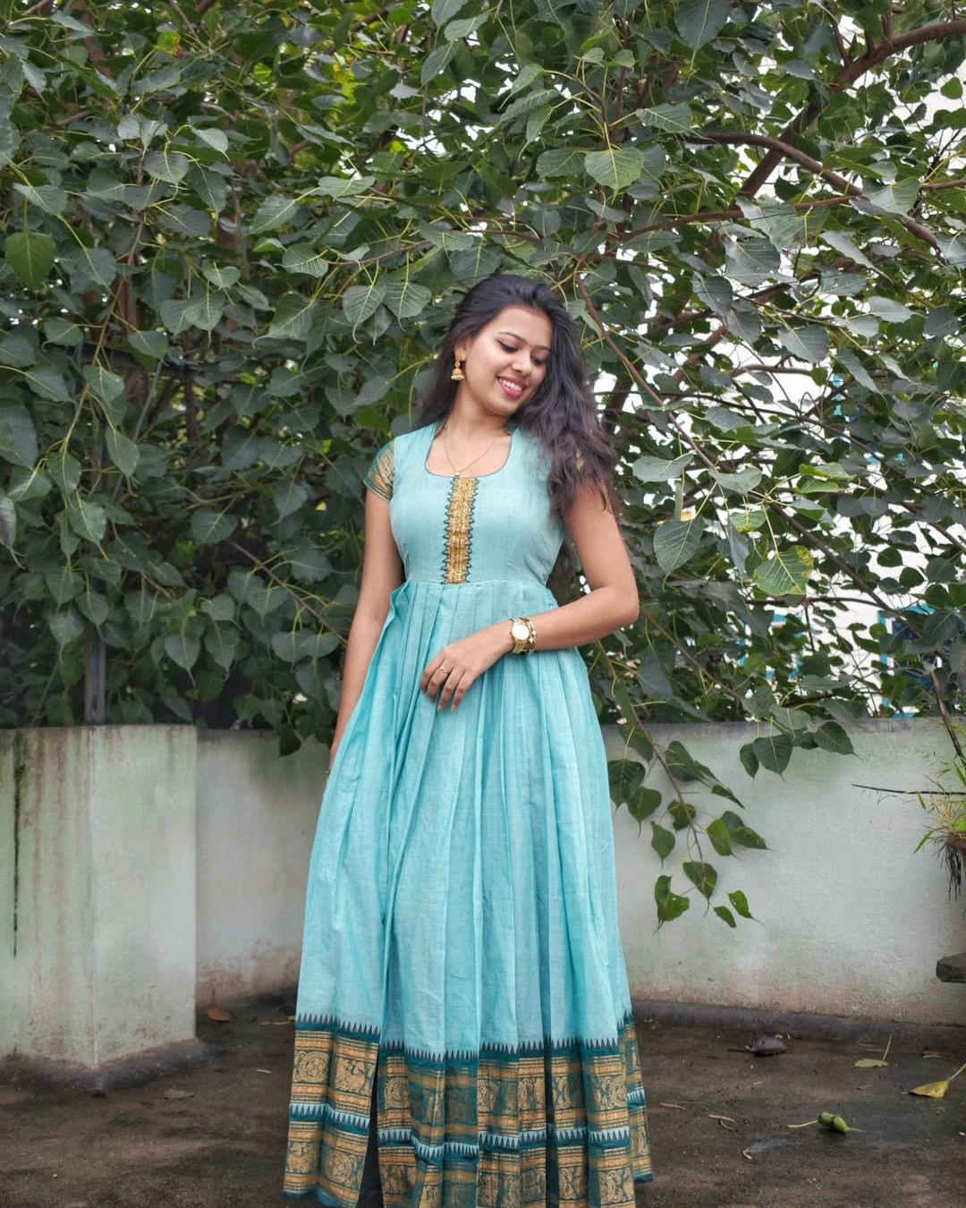 Ayushi - Sky Blue & Green Floor Length Pleated Gown | Petals Chennai